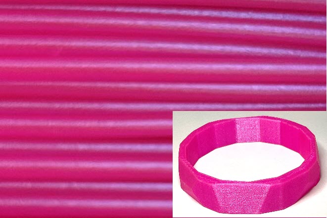 It is a hot pink with added shimmer, shine, and an iridescent blue tint. It is a strong and glossy filament and prints with a beautiful shine.